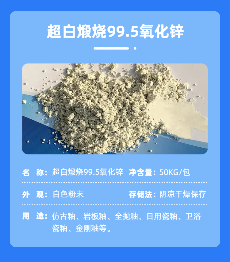 在全拋釉、金剛釉、超平釉、仿古釉等釉料中為什么要使用煅燒氧化鋅?經(jīng)煅燒后的氧化鋅性能穩(wěn)定,可減少陶瓷在燒成過(guò)程中釉面的收縮、減少因收縮而出現(xiàn)的禿釉和氣泡、針孔等缺陷,增加其密度避免出現(xiàn)釉漿呈“豆腐腦”狀的觸變情況,改善生釉性能。