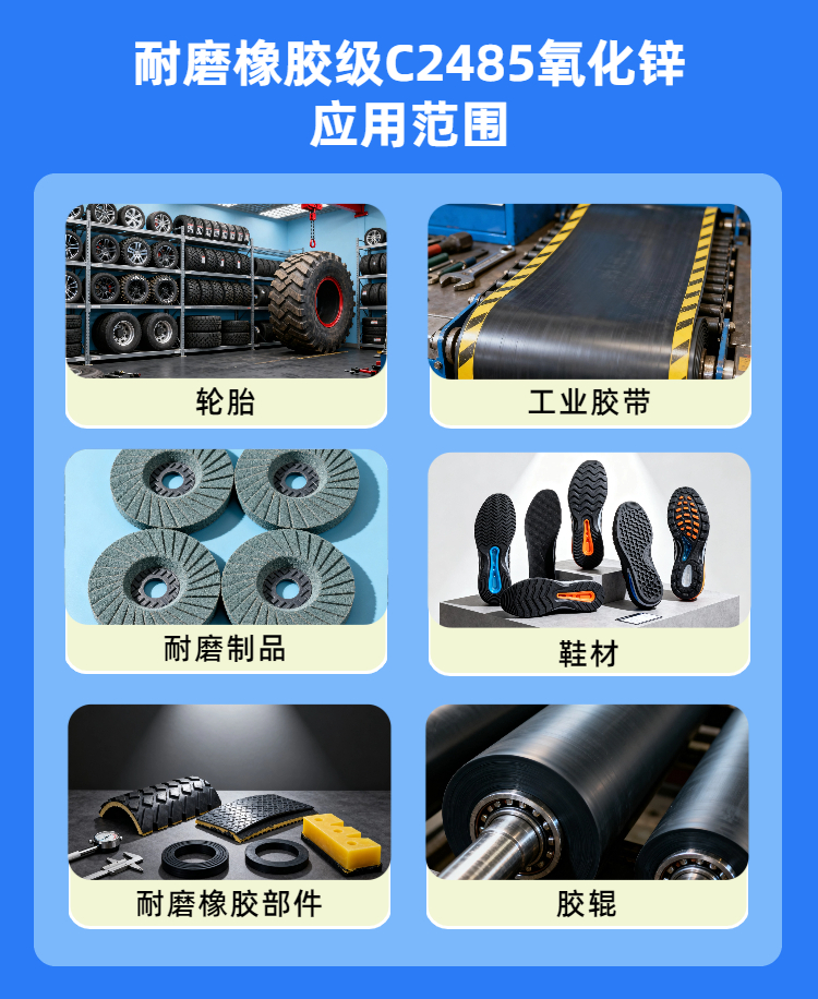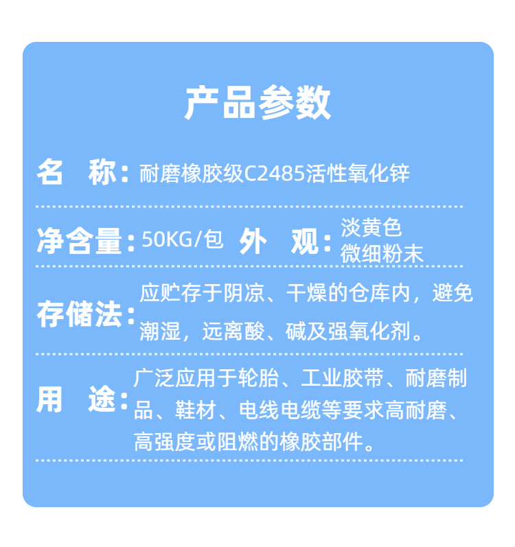 本品為橡膠工業(yè)設(shè)計(jì)的高活性氧化鋅,型號(hào)C2485,專門(mén)用于提升高性能橡膠制品的耐磨性、力學(xué)性能及硫化效率。采用特殊工藝制備,具有高表面活性和良好的分散性,適用于對(duì)耐磨性能有較高要求的橡膠制品。