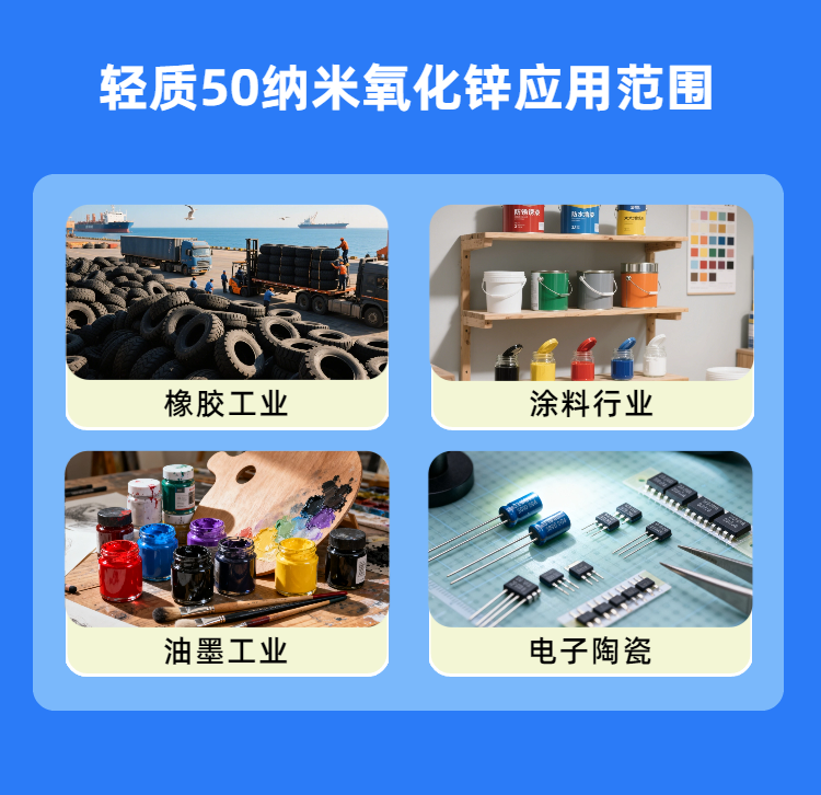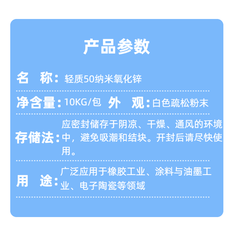 本產品是由肇慶市新潤豐高新材料有限公司采用低溫可控化學沉淀法制備的高純度納米氧化鋅。其平均一次粒徑嚴格控制在50納米左右,具備典型的六方纖鋅礦晶體結構、較高比表面積及良好的分散性能。產品為白色疏松粉末,廣泛應用于橡膠、涂料、電子、陶瓷等領域,作為高性能功能性添加劑,可顯著提升終端產品的力學性能、抗菌性、紫外屏蔽性和電學特性。