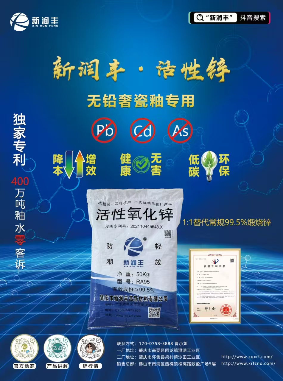 用量少但效果出色,例如在部分金剛釉應(yīng)用實例中,當RA95型釉用活性氧化鋅用量僅為普通直接法煅燒氧化鋅的一半(RA95型釉用活性氧化鋅3份對比普通直接法煅燒氧化鋅6份)時,其光澤度基本相同甚至更優(yōu)(應(yīng)用例“RA95型釉用活性氧化鋅3份”釉面光澤度95度,優(yōu)于應(yīng)用例“普通直接法煅燒氧化鋅6份”的92度),并且發(fā)色效果更佳(通過色差儀測定的a值和b值體現(xiàn)出更鮮艷、更純正的色調(diào))。此外,RA95型釉用活性氧化鋅的不斷升級迭代產(chǎn)品,還能夠使陶瓷制品具備抗菌除臭和分解有機物的自潔功能,大幅提升了陶瓷產(chǎn)品的質(zhì)量檔次和功能性,增強了產(chǎn)品在市場上的競爭力,為陶瓷企業(yè)帶來顯著的經(jīng)濟效益。